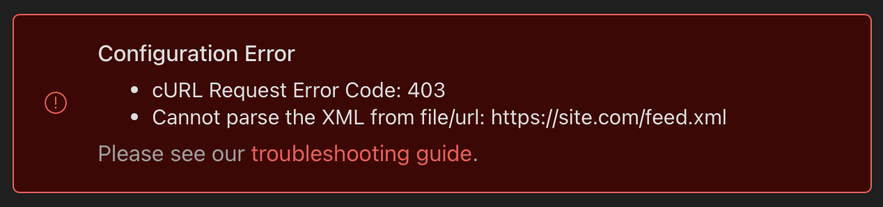 * Try running `curl https://site.com/path/to/feed.xml`in your command line and see what the result is. Often times this might return something like a CloudFlare error page, or some other HTML based page that is not the expected JSON or XML response, which means there is an issue with your server that needs to be resolved before DataGrab can read the file. Sometimes loading the URL in a browser window appears fine making it appear as if it is a DataGrab issue, but using `curl`will reveal the real issue.